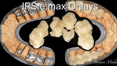 Выполнено восстановление формы и цвета верхних боковых зубов (15 - 25) керамическими вкладками, накладками и полукоронками e.Max