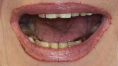 Выполнена плачтика десенного края, увеличение вертикального размера окклюзии, замена металлокерамических конструкций на безметалловые коронки, полукоронки, виниры e.Max, проведена установка имплантов и протезирование с опорой на импланты